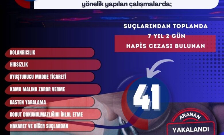29 Eylül – 5 Ekim 2025 tarihleri arasında gerçekleştirilen operasyonlarda, çeşitli suçlardan aranan toplam 41 kişi yakalandı.
